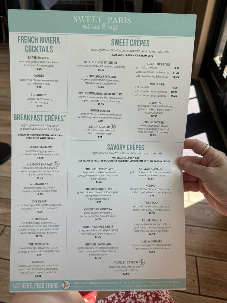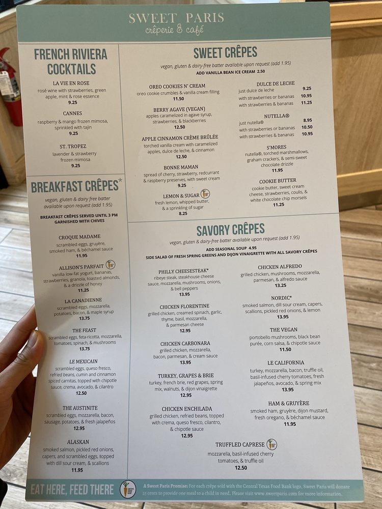 Located in Austin, Texas, Sweet Paris Creperie and Cafe is a charming cafe that offers a variety of delectable crepes. With a focus on providing a cozy atmosphere and exceptional service, this cafe stands out for its vegan options, wheelchair accessibility, and gender-neutral restrooms. The menu features a range of sweet and savory crepes, all made to order using fresh ingredients. Enjoy a relaxing meal on the outdoor seating area, take advantage of the free Wi-Fi, or indulge in happy hour specials with a glass of beer or wine. Whether you're looking for a quick bite to go or a leisurely dining experience, Sweet Paris Creperie and Cafe has something for everyone. Don't miss out on the opportunity to try their delicious crepes and experience the unique charm of this cafe.